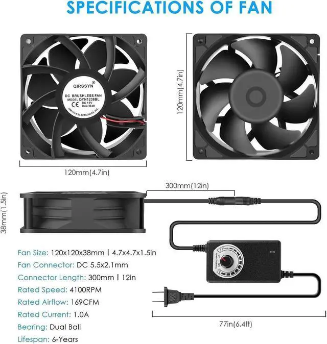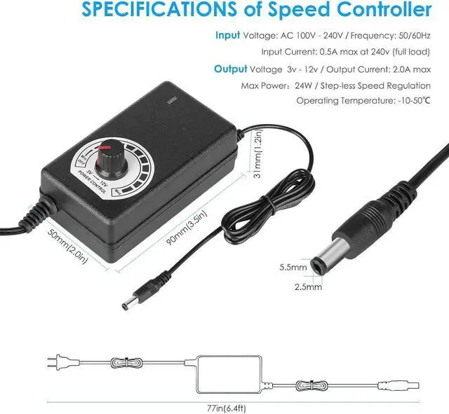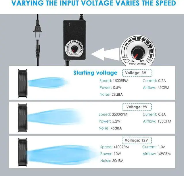 Rated Current: 2.0A | Speed control great for fine tuning, Varying the input voltage varies the speed. Completely adjustable from off to full blast. enables the fan to be powered through an AC outlet.