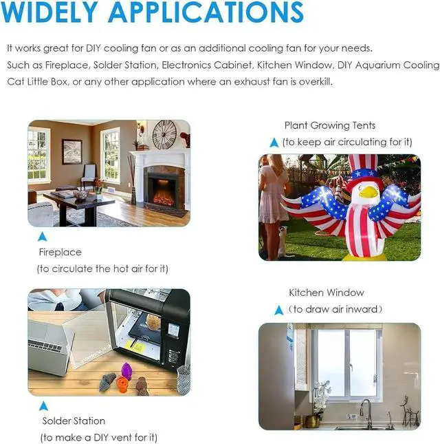 Good DIY Cooling SolutionIt works great for DIY cooling fan or as an additional cooling fan for your needs. Such as Fireplace, Solder Station, Electronics Cabinet, Kitchen Window, DIY Aquarium Cooling, Cat Little Box, or any other application where an exhaust fan is overkill.