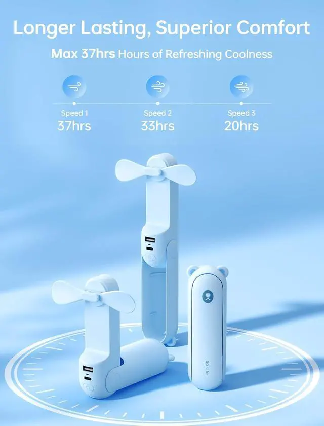 Super Long Endurance and Updated Strong Airflow: Adopted the advanced technology, it lasts for 37 hours at speed 1, 33 hours at speed 2, 20 hours at speed 3 after about 3-4 hours full charge. With enlarged blades, the wind increased 30% compared to the original version. The maximum rotating speed of the fan is 3000 rpm which is enough for personal use to keep you cool