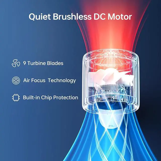 9 Blade Design - Ultra Quiet: With 9 ultra-quiet blades, this mini portable fan operates at a low noise level of 56-76 dB, ensuring a peaceful wind speed experience. And the aerodynamic blades deliver strong, stable airflow for optimal comfort