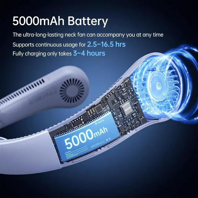 Up to 16.5 Running Hours & USB Charging: Equipped with a high-capacity 5000mAh battery, this rechargeable neck fan delivers 2.5 - 16.5 hours of runtime, depending on the airflow speed setting selected. Taking just 3 - 4 hours to fully charge via USB Type-C, this cooling neck fan can also be used while charging, so you can keep the cooling air flowing.