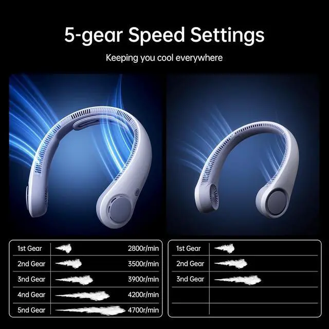 Powerful Airflow With 5 Speed Settings: Featuring 2 air inlets and multiple air outlets on both sides, this cooling neck fan blows cold air to the neck and face at 5 adjustable speed settings. Simply tap the personal neck fan power button to rotate between different wind speeds to suit your needs.