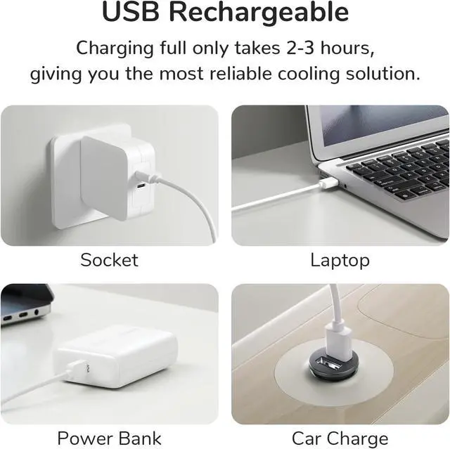 Rechargeable Battery: JISULIFE Rechargeable Handheld Fan with a built-in tough battery, can be easily recharged through a socket/laptop/power bank or any other device with a USB port. Just 2 hours will get fully charged (NOTE: Quick charge needs to meet 5V/2A current)
