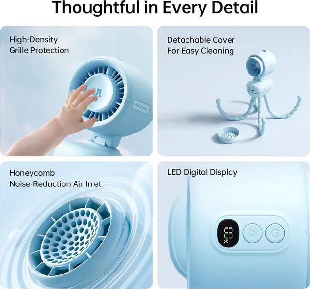 Stroller Fan: Ultimate Safety Design: Built for maximum protection, this stroller fan features a 4mm/0.15'' (Others: 5.6mm/0.22'') encrypted front grille to prevent tiny fingers from reaching the blades, a safety switch lock for secure use. Most importantly, it stands firmly on four foodgrade silicone brackets, ensuring stability and safety for babies in every scenario