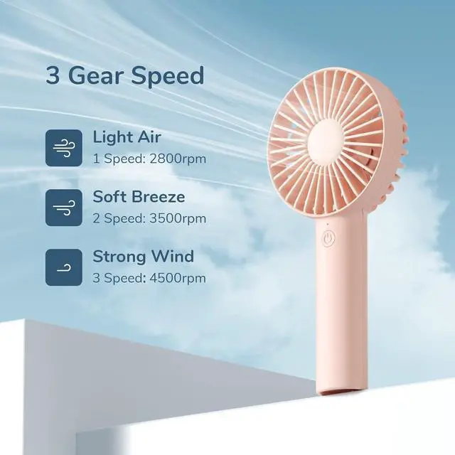 3 Wind Speed Gears: JISULIFE Hand Held Fan easily supports 3 wind speed adjustments with 1 button. Speed 1 is light wind for about 10 hours, Speed 2 is soft wind for 7 hours, and Speed 3 is strong wind for 3 hours