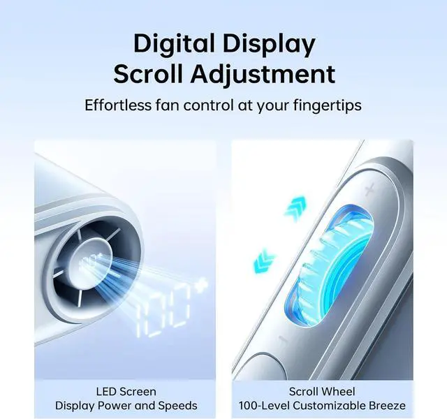 100-Speed Turbo Power with High-Efficiency Motor: Neck fan with 9-blade turbo fan and brushless motor blasts 8.5m/s winds (10cm distance) at 40,000 RPM max100 adjustable speeds from breezy to hurricane-grade cooling! High performance ensures rapid cooling, roller adjusts wind speed, balances strong power and portability, and provides an efficient heat dissipation experience in