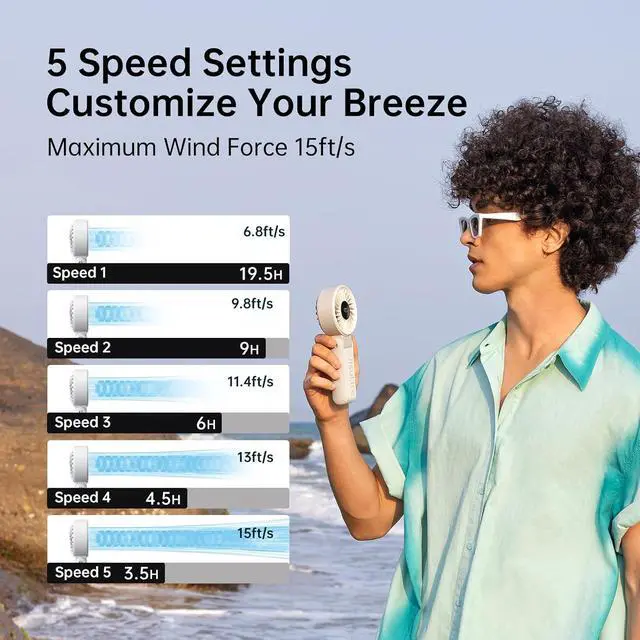 • LIFE7-Long Lasting Cooling with 19.5 Hrs Max: From early morning commutes to late-night camping trips, enjoy up to 19.5 hours of cooling at speed 1; This personal fan is a lifesaver for long office days, or any outdoor activities