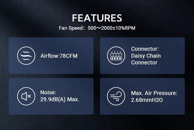 [PWM Functional]The PWM fan control allows for dynamic speed adjustment between 500 rpm to 2, 000 rpm, minimizing noise or maximizing airflow. Noise: 29.9dB(A) Max.