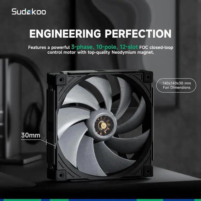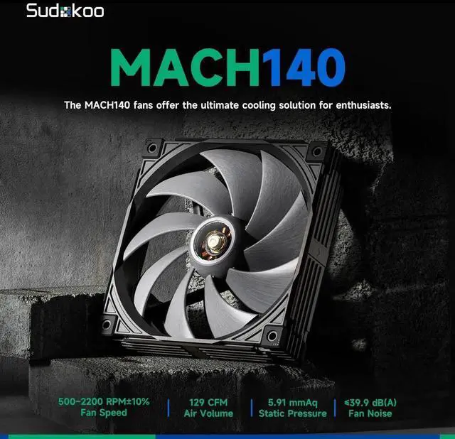 EXTREME COOLING PERFORMANCEWith high-performance 3-phase, 10-pole, 12-slot FOC closed-loop control motor, Sudokoo 30mm Thick MACH140 PC cooling fan can reach PWM range of 500-2200 RPM ±10% with airflow of 129 CFM and air pressure of 5.91 mmAq.