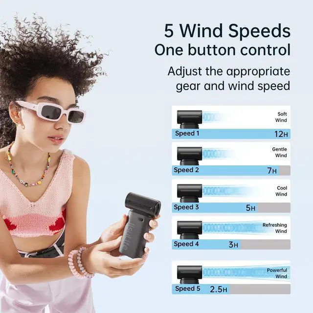 Long Battery Life: Equipped with a 3600mAh battery, the fan offers 2.5-12 hours of continuous use, with 5 adjustable wind speeds.