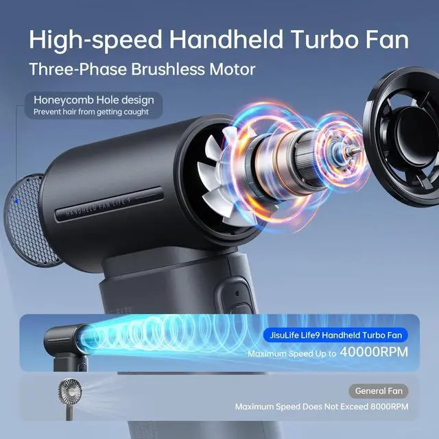 JISULIFE Portable High-Speed Turbo Fan: Ultimate Coolness & ConvenienceIntroducing the JISULIFE portable high-speed turbo fan, designed to keep you cool and comfortable wherever you go. Powered by a high-speed brushless DC motor and 9 turbine blades, this fan delivers concentrated airflow to efficiently dissipate heat, making it perfect for hot summer days.