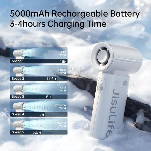 Long Battery Life: Equipped with a 5000mAh battery, the fan offers 2.5-18 hours of continuous use, with 5 adjustable wind speeds.