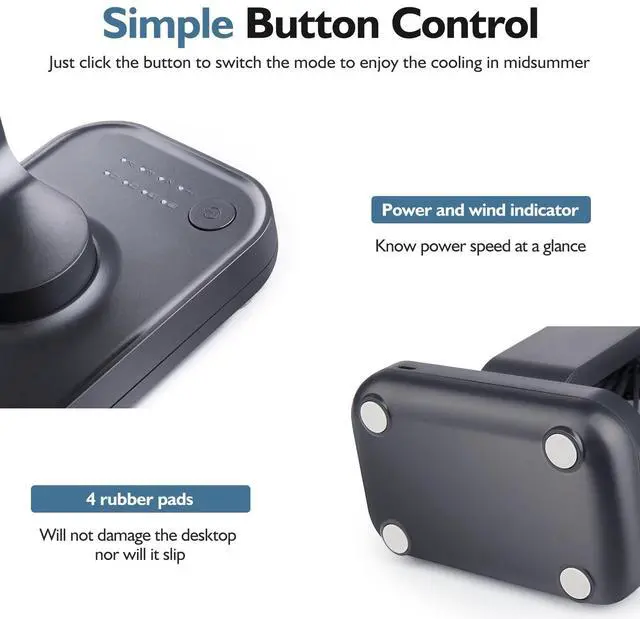 The fan is small and delicate with button, indicator and rubber pads