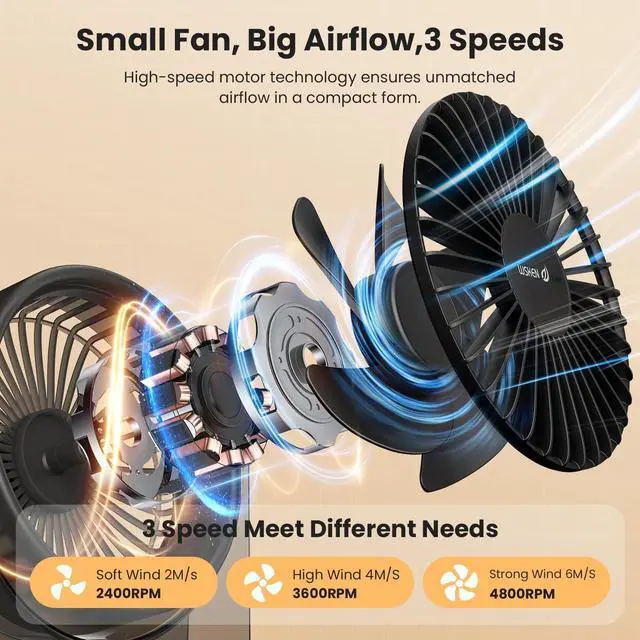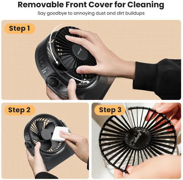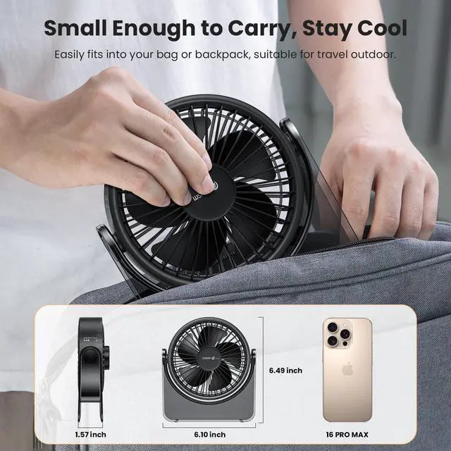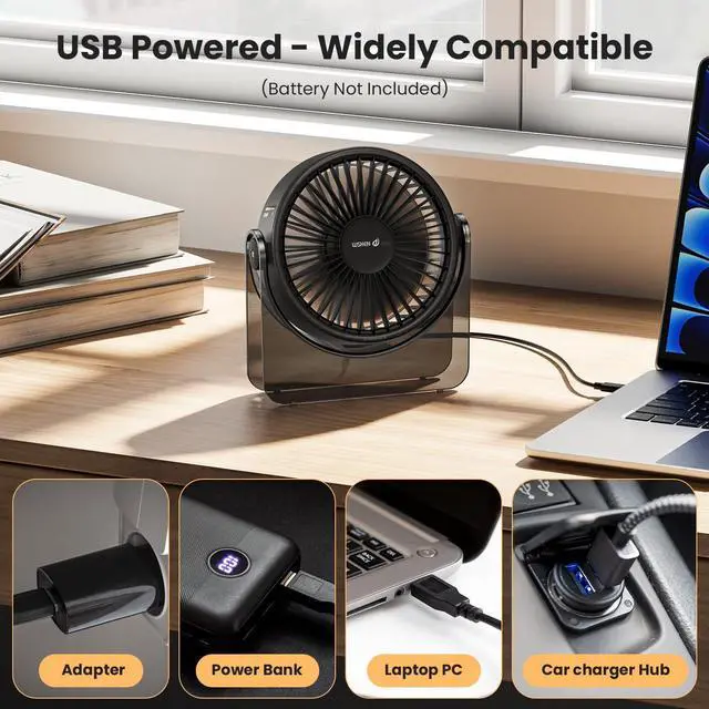 Stay Cool in Style with Our Portable USB Desk Fan! Elegant Design: Measuring just 6.49" x 6.10" x 1.57" and weighing only 0.57 lb, this small desk fan features a clear acrylic base and frosted matte finish for a sleek, modern look. Perfect for adding elegance to any desktop, bedroom, or office. Powerful Performance in a Compact Size: Despite its mini design, this personal fan packs a punch with a 6000RPM motor, delivering airflow up to 16FT and speeds up to 6M/S. Choose from 3 speed settings (low/medium/high) via a single button for tailored cooling comfort. Removable Front Cover for Easy Cleaning: The detachable front cover makes maintaining your fan effortless. Keep the blades and grill free of dust and dirt to ensure fresh, clean air at all times. Ultra-Quiet Operation: Even at maximum speed, this mini fan operates at under 50 decibels, ensuring a peaceful environment. Anti-vibration silicone pads reduce noise, making it ideal for bedrooms, bedside tables, dorm rooms, and offices. USB Powered & Portable: Compatible with PCs, laptops, power banks, AC adapters, car chargers, and more, this rechargeable fan is energy-efficient and travel-friendly. Its lightweight and compact design make it the perfect companion for outdoor adventures, camping trips, or beach days. Whether you need a quiet cooling solution for work, sleep, or travel, this versatile desk fan is the perfect blend of functionality, portability, and style.