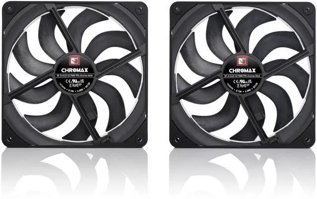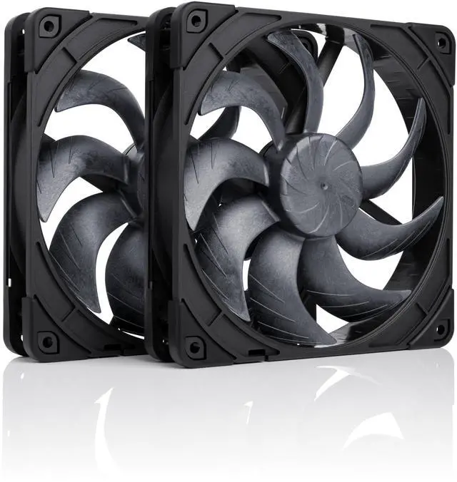 State-of-the-art quiet cooling performance for PC cases and water cooling radiators in a sleek all-black design: The chromax.black dual set of the award-winning NF-A14x25 G2 140mm fan. Succeeding the iconic NF-A14, the NF-A14x25 G2 has quickly established itself as a new benchmark for premium quality quiet 140x25mm fans. Its advanced aerodynamic engineering featuring a novel Progressive Bend impeller design with Centrifugal Turbulator hub, winglets and a record tight tip clearance of only 0.7mm enables the G2 model to provide a significant boost in performance-to-noise efficiency over its renowned predecessor. The Sx2-PP set contains two fans that are slightly offset in speed (+/- ~25rpm) in order to avoid undesirable harmonic phenomena such as beat frequencies, which can be heard as intermittent vibrations or periodic humming due to interference. This makes it ideal for both push-pull applications and situations where two or more fans are running side by side such as in typical case fan configurations as well as on 280 or 420mm water cooling radiators. Topped off with Noctua’s trusted premium-grade SSO2 bearing and more than 150,000 hours MTTF, the NF-A14x25 G2 PWM Sx2-PP chromax.black is the perfect choice for users who are looking for a dual 140mm fan set that combines cutting-edge quality, quietness and performance in an all-black style.