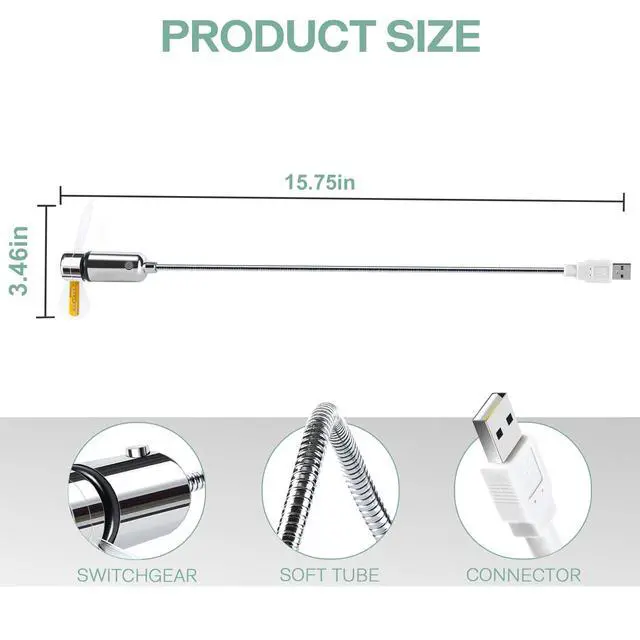 USB fan cable is 15.75 inches long. Twist and rotate in multiple directions for everyday use in multiple venues, ideal futuristic gadget!