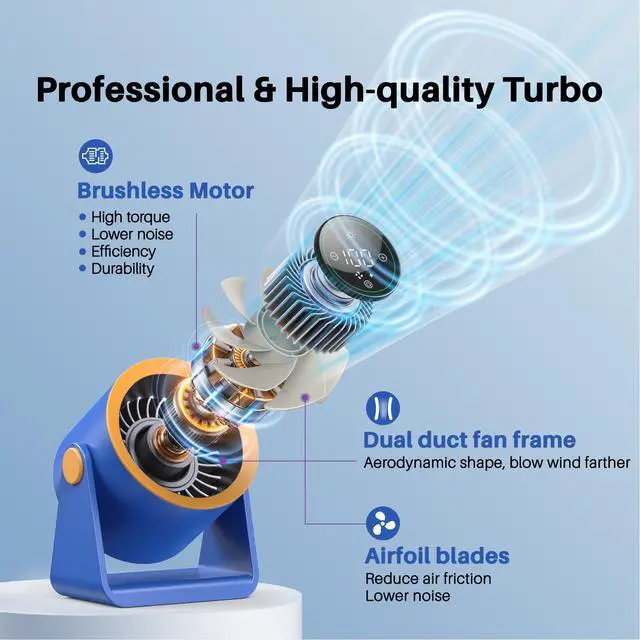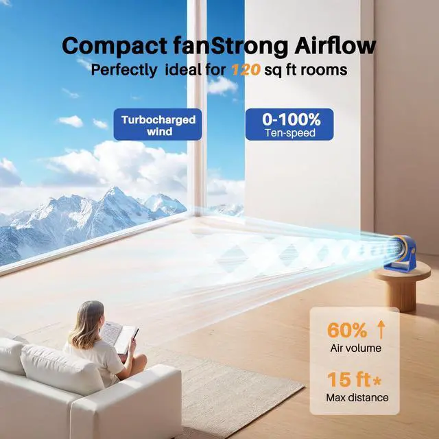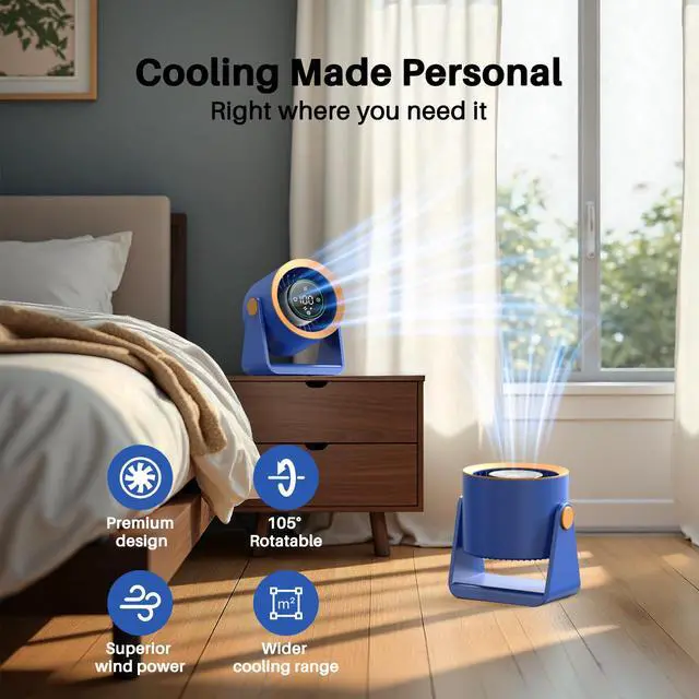 , Ausic Desk Fan combines compact design with high performance. Its exclusive TurboSilent Technology mimics aircraft turbine mechanics and features an innovative wind tunnel design, pushing air up to 25 feetenhancing cooling air circulation by 200% compared to traditional fans. With a 105° adjustable angle, it ensures optimal airflow for rooms up to 120 sq ft. Must-have summer essentials for your home!