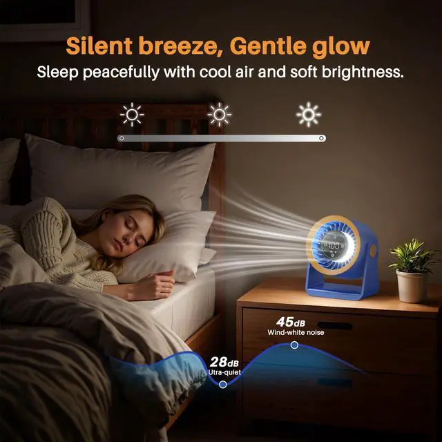 - This fan features advanced noise reduction technology, equipped with a brushless DC motor for frictionless performance and a winglet fan design that reduces turbulence, it operates at a whisper-quiet 28dB. Peaceful Cooling for your bedbeside, offices, or any space where tranquility matters!