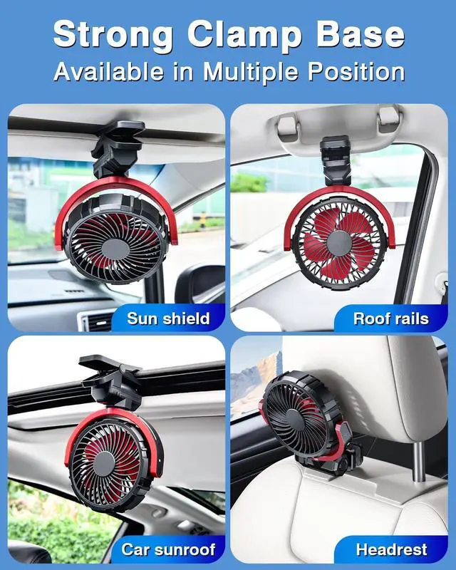 Multiple Positions This car fan features a clip - on design, allowing it to be flexibly installed in many positions, such as the sun visor, roof handle, car sunroofs, headrests, etc. It is convenient for both front and rear seat passengers