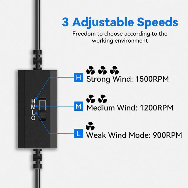 3 Adjustable Wind SpeedsThe USB cooling fan features a 3-speed controller (low, medium and high) to control the wind speed. Rotating Speed: 900/1200/1500 RPM. Depending on the operating environment, you can choose between different wind speed levels.