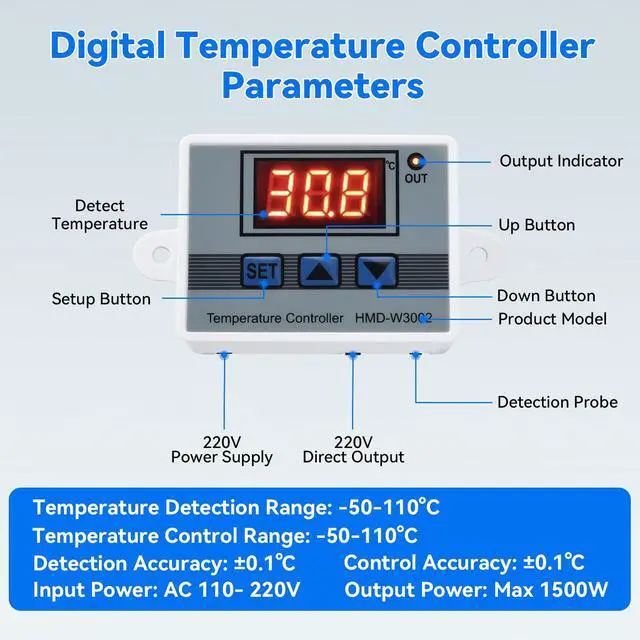 Thermostat InformationTemperature Control Range: -50-110°C; Control Accuracy: ±0.1°C; Temperature Refresh Rate: About 1 Second; Input Power: DC 220V; Output Power: 1500W. It enables intelligent heat dissipation management, avoiding the issues of noise or insufficient cooling associated with traditional fixed-speed fans.