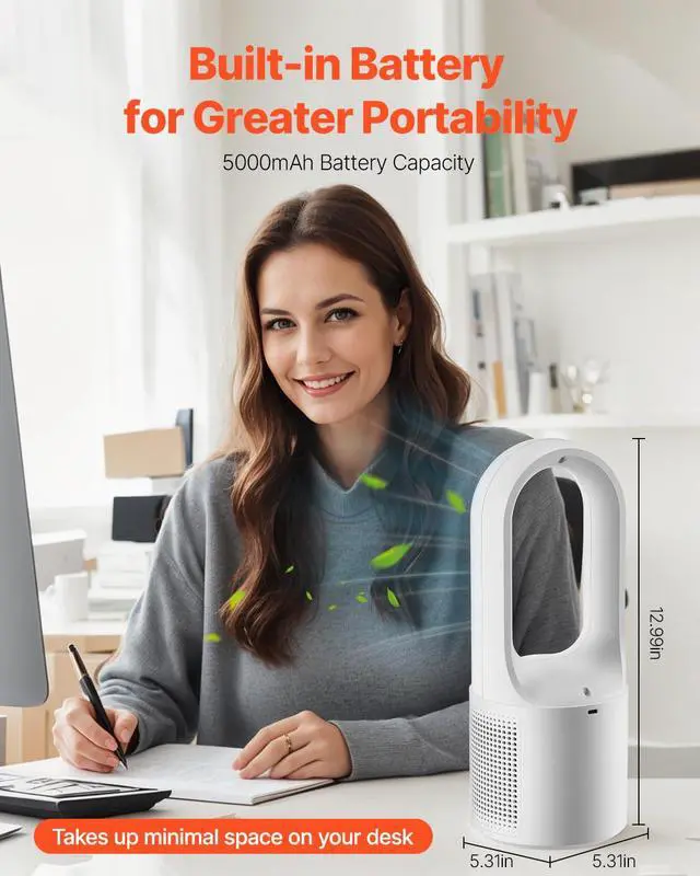 Compact and versatile, this portable bladeless fan fits effortlessly into various space. Its cost-effective, ready-to-use design requires no assembly, adding flexibility to your home life.