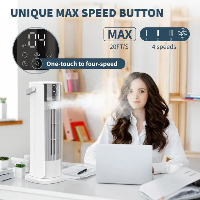 Instantly CoolingThe mist tower fan has 4 speeds, ranging from relaxed breeze to strong airflow. Yet you can also just press the strong airflow button to instantly reach 4 speeds, which is great for when you come back from out and need to cool down immediately.