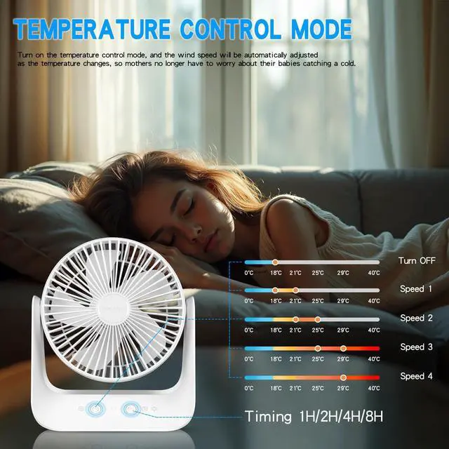 Designed for sleepThis upgraded table fan has 5 gears in total. Each short press adds a gear, cycling from gear 1 to 5, and pressing again turns it off. The speed of gears 1 to 4 changes from low to high, and the 5th gear is the automatic temperature control gear (also called sleep mode).this mode can automatically adjust the gear according to the ambient temperature. Notice:Temperature <=18C -- the fan automatically shuts down.