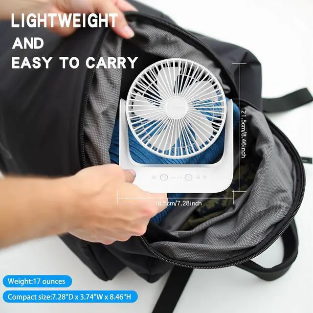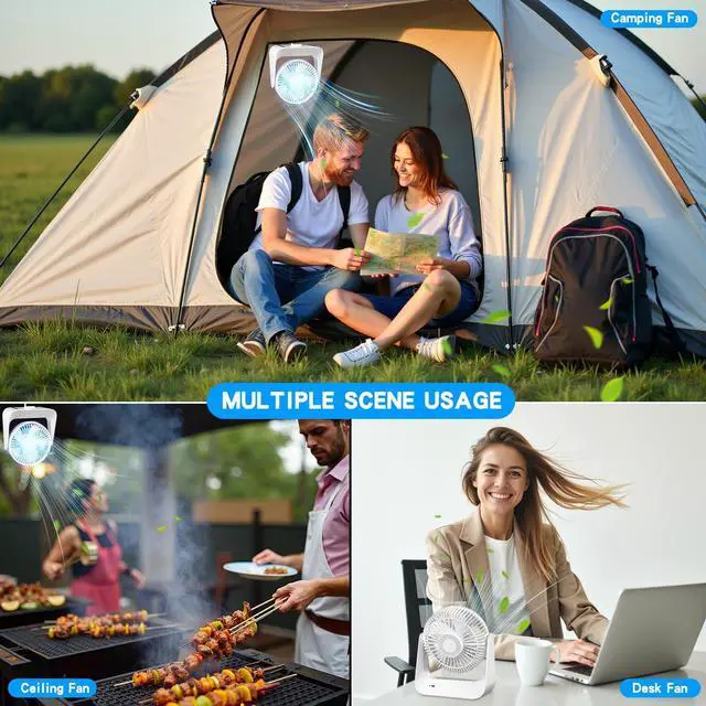 Multiple Placement MethodsThis desktop fan comes with a built-in hook at the bottom, which can be easily hung on a tent, tree branch or car, or simply placed on a table at home or in the office. It is not only our best choice for indoor and outdoor, but also a good partner for babies and pets.