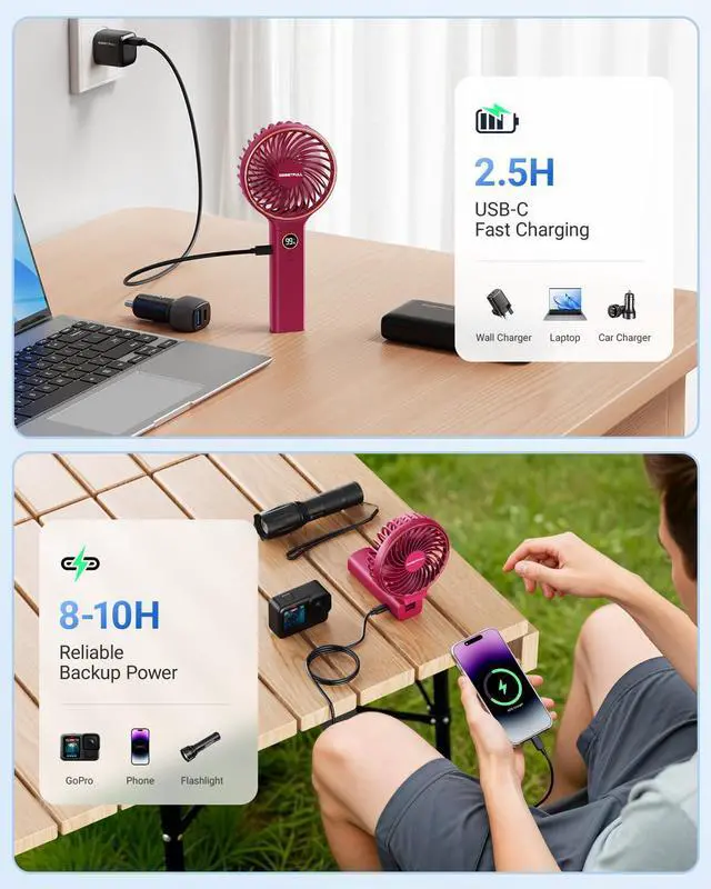 One-Button & Backup Power: Foldable hand held fan with one-touch air volume adjustment, doubles as a mobile power source for emergency charging of phones, laptops, and other devices
