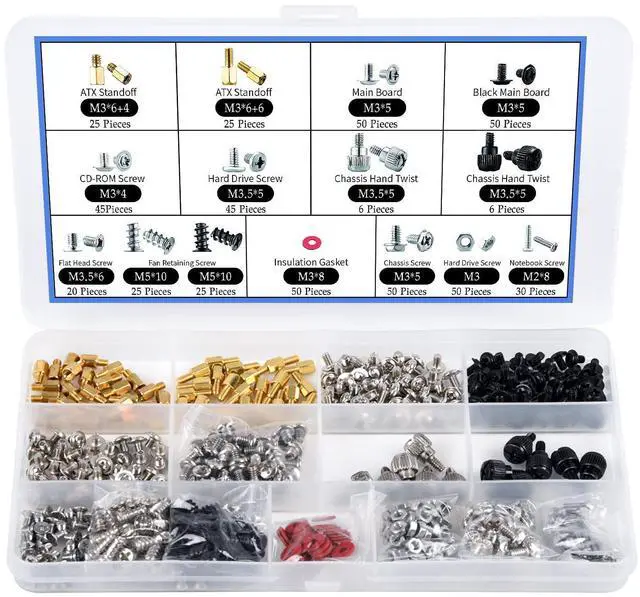 Total 15 different computer screws with 502 pcs for motherboard, ssd, hard drive mounting, computer case, power supply, graphics, computer fan, CD-ROM drives, DIY PC fixed installation or repair.