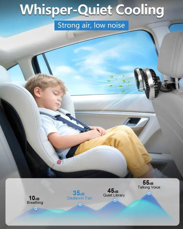 Dual Fans for Enhanced Backseat Airflow: Designed with dual fan heads to deliver more airflow and wider coverage. Quickly cools down the back seat during hot daysperfect for kids, babies, and pets on daily drives or long family road trips