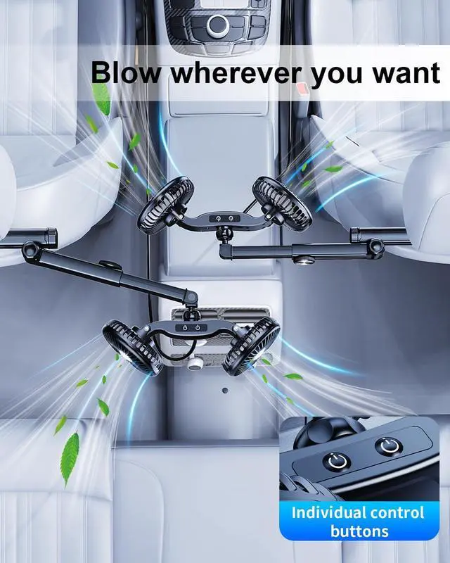 3 Speeds, Independent ControlThis dual-head car seat fan has 3 speeds, each fan has independent control buttons, which can immediately provide strong air to cool backseat passengers and backseat pets when the car air conditioner is weak or not available at all.