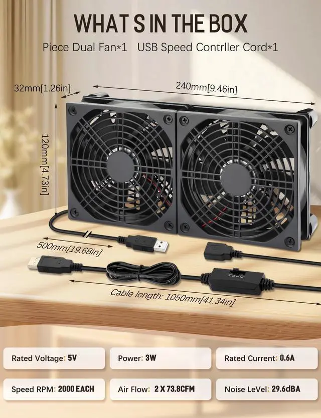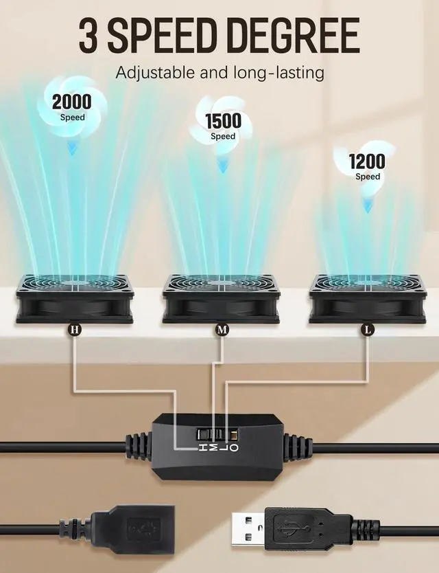 This 120mm usb fan, perfect as a case fan, desktop fan, and vent fan booster, features a dust screen and a three-speed adjustable speed controller. It comes with installed feet for ventilation space and a USB-A connector for easy use. It’s also a small electric fan suitable for various cooling needs
