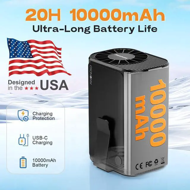 20 Hours of Run Time: The fan is powered by a 10000mAh rechargeable battery, offering up to 20 hours of use on the lowest speed setting. Featuring an AI smart chip, it can operate while charging, ensuring convenience. The fan also includes a 5V-1A Type-C input for easy and quick recharging.