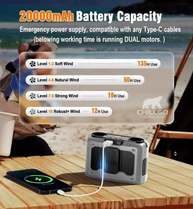 Quick Charge, Long-lasting Power - The battery powered fan charges fullly within quickest 6HRS and has 20000mAh large battery capacity, ensuring long-lasting power supply, up to 135 working hours with dual motors running together. You can enjoy the cool breeze for an extended period without the need to recharge frequently
