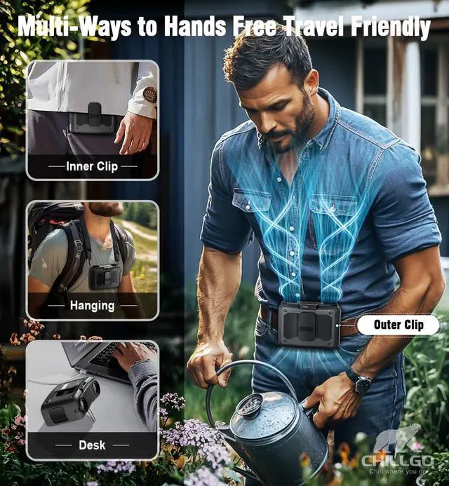 Multi-functional, Highly Practical - 5-in-1 battery operated fan with the integrating multiple functions such as waist-clipping, handheld, neck-hanging, etc., and supporting reverse charging in emergencies, it meets diverse needs with ingenious design