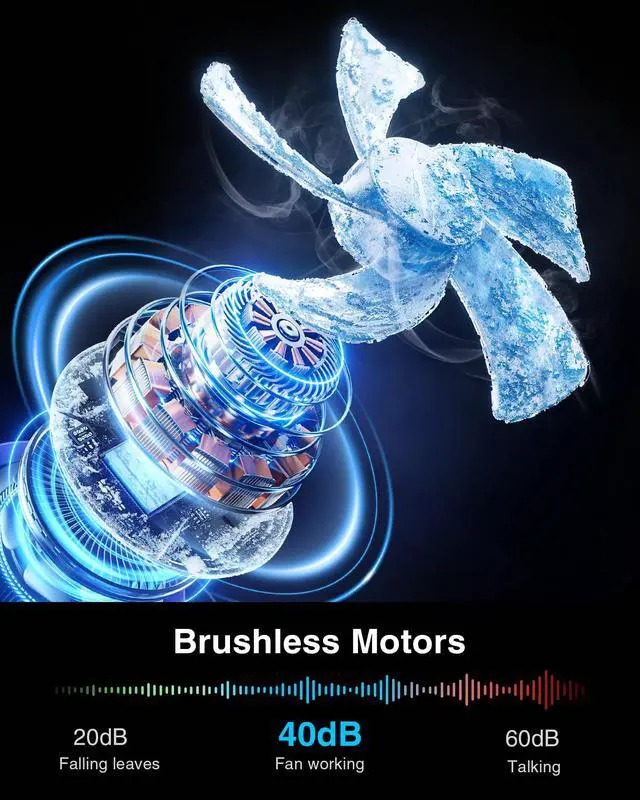 Strong Wind & Quiet Design: This portable fan has Infinite wind speed to meet different needs and keep you comfortable whether you're at home, camping, or on the go. The brushless motor and upgraded fan blades ensure efficient operation with minimal noise, offering a tranquil experience with 40dB.
