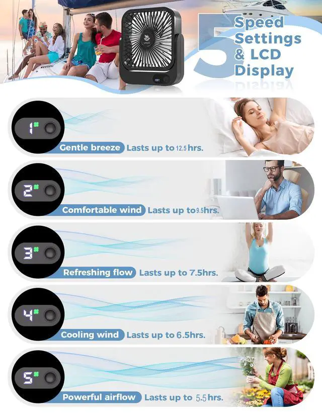 Rechargeable & Plug-In Powered by a 5000mAh battery, this fan supports both USB charging and plug-in use. Enjoy up to 12 hours of cooling on low speed or 6 hours on the highest setting. Versatile for cruise nights, travel, or workspaces.