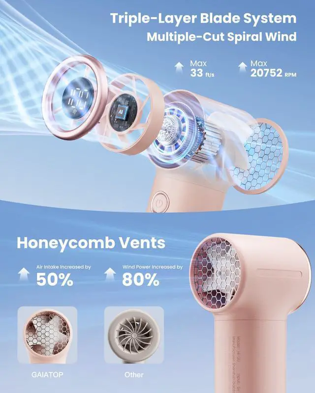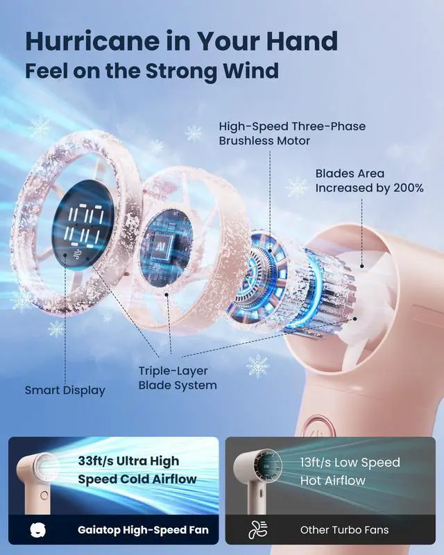 Powerful Wind, Fast Cooling: Gaiatop handheld fan is equipped with a high-speed three-phase brushless motor, triple-layer blade system, and honeycomb vents, increase air intake and output wind power. With a 20752RPM maximum turbo speed, releasing 10 m/s multiple-cut spiral airflow, blowing faster and stronger cooling winds for potent cooling. This hand fan is perfect for summer days, hot flashes, outdoor camping relieving the heat for all women, men