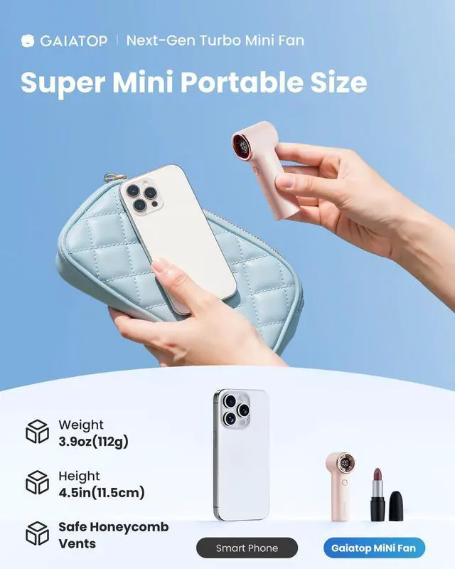 Super Mini Lipstick-Size & Lightweight: This mini fan handheld adopts super compact design, with 1.39*1.75*4.5in, only 3.9oz, lighter than your phone. The turbo fans designed with mini and lightweight size, allows you to easily put it in your pocket, purse, clutch, cross bag; It also can firmly free standing on the desktop by anti-slip mat on the bottom. Portable fans for travel, hiking, football games, sports, concerts, weddings, trips