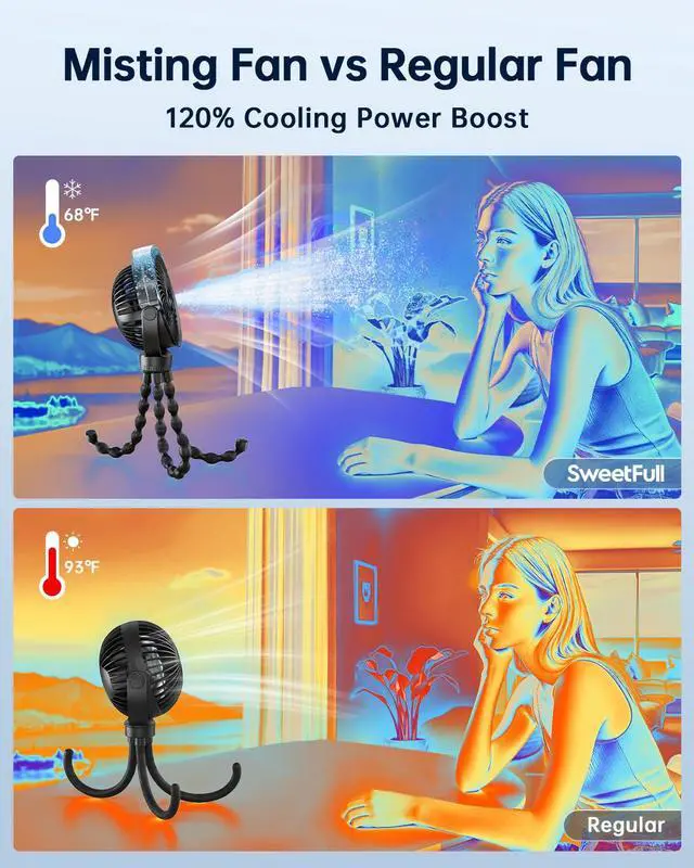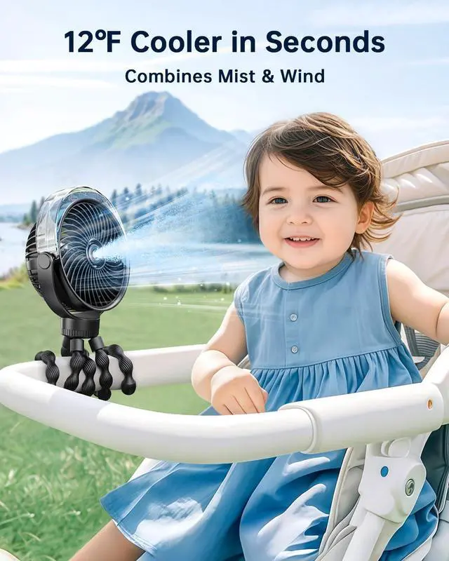 Mist + Wind Combo for Fast Cooling: This upgraded stroller fan combines ultra-fine mist and powerful airflow, boosting cooling efficiency by up to 120%. Mist and fan can work together or separately, with dual mist modes (continuous/intermittent) for outdoor walks or summer travel