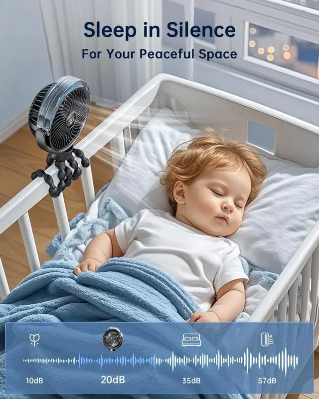 360° Adjustable & Detachable Tripod: Fan head rotates 360° horizontally and 150° vertically for targeted airflow. The flexible tripod wraps securely around strollers, cribs, or desks and detaches easily for charging or repositioning