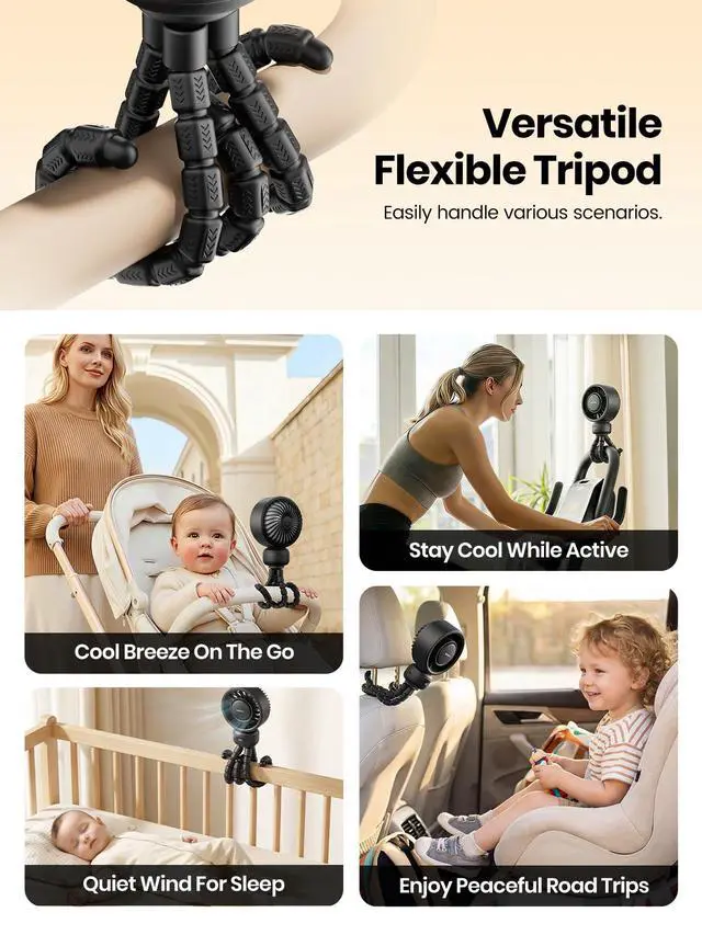 FLEXIBLE TRIPOD FOR ULTIMATE VERSATILITYDesigned with upgraded flexible legs, this pram fan grips firmly onto any surface. It serves as a versatile clip on fan for prams, a secure wrap-around buggy fan, or a stable desk fan. Whether attached to a car seat, stroller or used as essential pushchair accessories, the durable tripod is easy to bend, making it a must-have for both baby and parents.