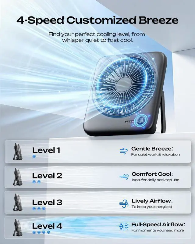 The 180° folding of this desk fan lets you direct airflow precisely where you need it, whether working or relaxing in bed.