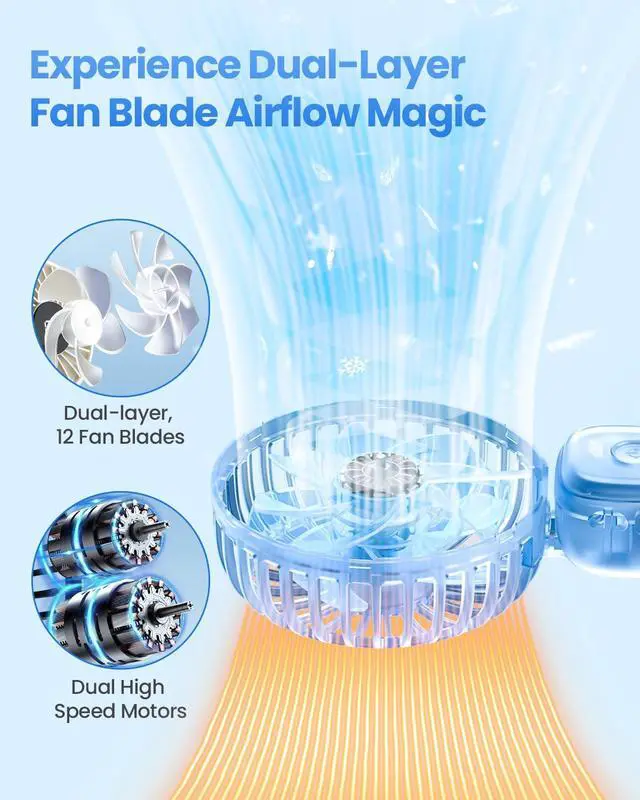 Design for the South: 12 Blades on 2 High Speed Motors, our portable fan transmits rich cool breeze 236inch/s, 2.5 times faster than those mini fans, cool you down immediately once started, excellent for people living in Florida, Texas, tropical area and those work outside, lifesaver for women when hot flash comes