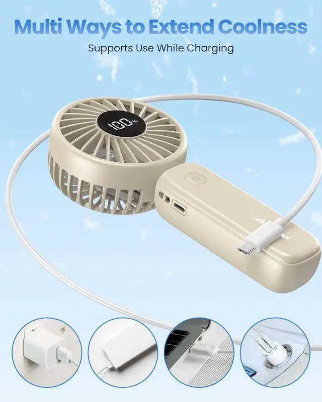 Handheld/Desk/Neck Fan: With its multi-functional design, you can grab it as a handheld fan during commuting and hiking, place it on a table for a refreshing breeze from any angle while working, doing makeup, or relaxing outdoors. You can also wear it around your neck with the lanyard for hands-free cooling and easy portability