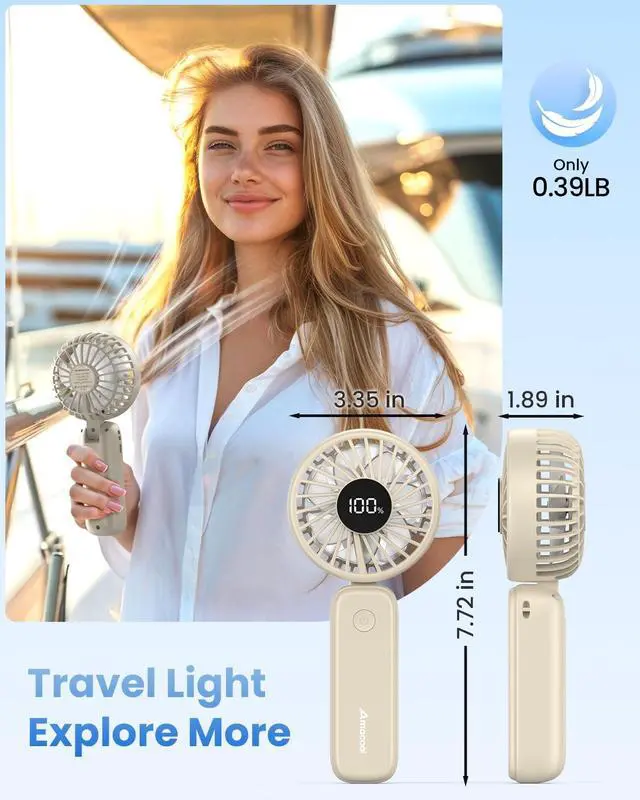Extended Battery Life & Smart Display: Upgraded with high-performance 5000mAh rechargeable battery, this portable handheld fan provides up to 15 hours of cooling, perfect for extended outdoor activities, travel, or daily use. LED display shows wind speed and battery life, so you can recharge in time, stay cool and keep you look at best at concerts, outdoor weddings, ball games, cruise trip, shopping