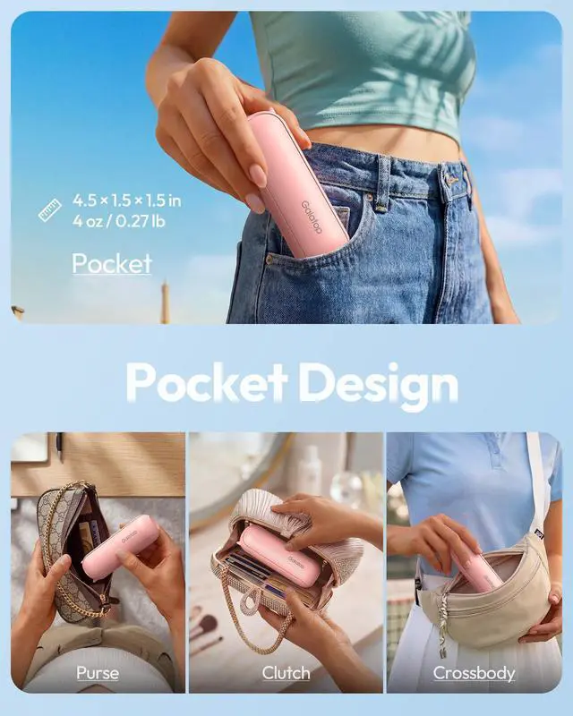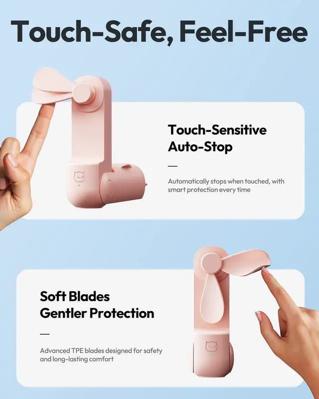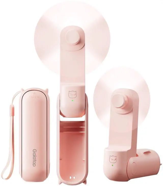 3 in 1 Handheld & Desk Fan: With 3-stage foldable design, the pocket fan with hidden soft blades allows for easy storage and on the go cooling, and can be easily fitted into any bag, purse, pocket, backpack. Use it as a handheld portable fan at 180° unfolded; Work as a mini desk fan at 90° or 270° to keep you cool at theme park, camping