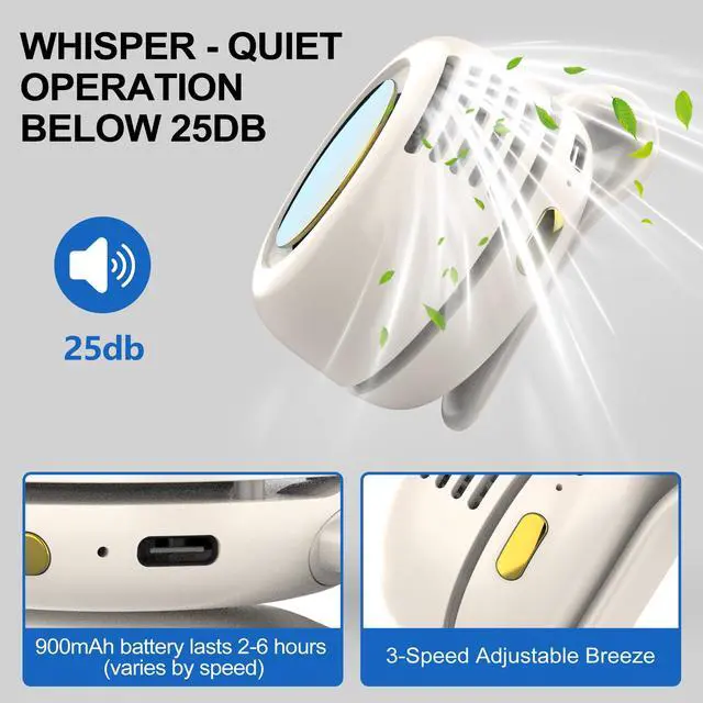 Portable Silent Clip On Bladeless Fan, Rechargeable Wearable Fan - Hands-Free Waist & Neck Cooling, 3 Speeds, 6H Runtime, USB-C Fast Charge (White)